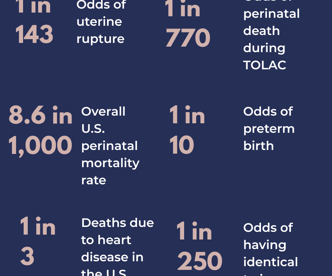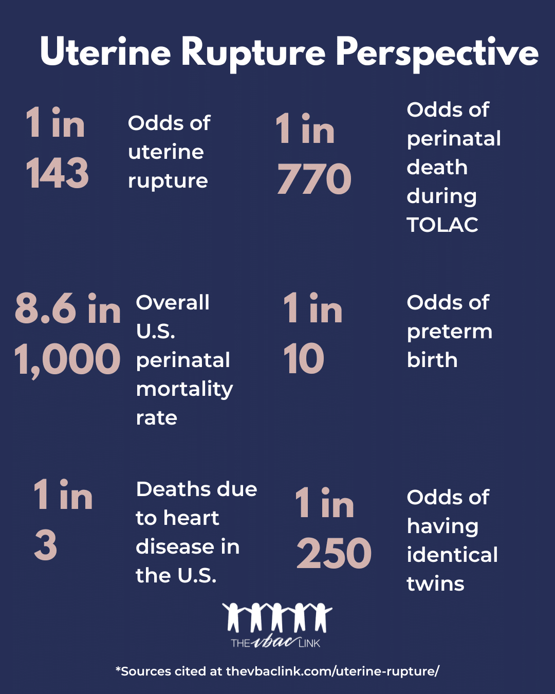 For comparison, the average perinatal mortality rate for the U.S. in 2023 was 8.6 per 1,000 births. That’s 1 in 120. This comparison is HUGE. All birth has risks; TOLAC is not the only option that presents a risk. You are deserving of the information to weigh the risks and benefits and decide for yourself what your risk tolerance is, and choose the birth option that is best for you and your family.
